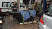 Schreinermeister Thomas Grund hatte eine hervorragende Lösung parat und baute im Vorfeld eine Rampe. Beachtlich mit welcher Präzision dies vorbereitet war und mit welcher Ruhe und Fachkompetenz die Mitarbeiter der Schreinerei Grund diese spektakuläre und schwierige Anlieferung durchführten.