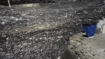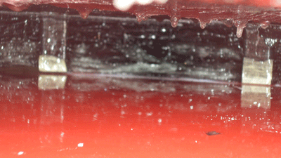 Bei genauer Betrachtung erkennt man Tropfen, die sich von oben nach unten gezogen haben (gleich Stalaktiten), aber auch in gegenteiliger Form (Stalagmiten) entstanden sind.