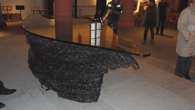 Erst durch den Abschluss mit einer Glasplatte, die der Form eines Fisches ähnelt, wird das Kunstwerk zu einem Tisch.