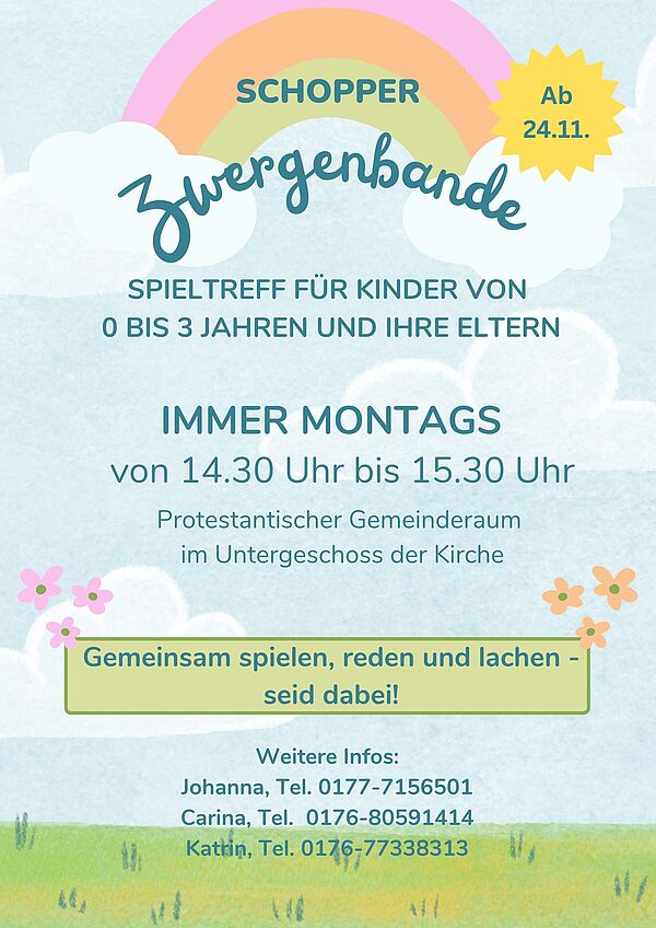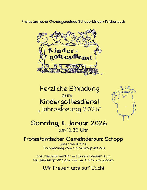 Im Jahr 2025 haben wir den Schopper Kindergottesdienst (KiGoDi) wieder aufleben lassen. Mit neuen Ideen und Motivation trafen wir uns im Sommer, um die ersten Termine zu planen. Ende August starteten wir mit dem Eröffnungs-KiGoDi im Rahmen des Sonntagsgottesdienstes mit Herrn Pfarrer Hust in der Prot. Kirche Schopp. Er stellte in einer Geschichte über Gemeinschaft das „kleine WIR“ vor, welches uns als Maskottchen zukünftig im KiGoDi begleiten wird. Der erste KiGoDi fand im September im Gemeinderaum der Prot. Kirche statt. Wir hörten, dass das „kleine WIR“ glücklich ist, wenn wir gemeinschaftlich und freundlich miteinander umgehen. Streit und Ungerechtigkeiten mag das „Wir“ hingegen gar nicht. Der KiGoDi im Oktober behandelte das Thema Dankbarkeit und Erntedank. In einer gemütlichen Runde tranken wir Tee und dankten Gott für seine Gaben. Zudem gestalteten wir bunte Herbstbäume mit Fingerfarben. Im November leuchteten viele Lichter im KiGoDi und wir erfuhren, dass Gott Licht ins Dunkel bringt. Passend dazu bastelten wir leuchtende Teelichtgläser. Im Dezember trafen wir uns zur Sternstunde und hörten, was der kleine Stern auf dem Weg zur Krippe erlebte. Nach gemeinsamem Basteln von glitzernden Sternen feierten wir die Eröffnung des Adventsfensters unserer Kirche. Wir erfreuen uns an der wachsenden Anzahl der Kinder und bedanken uns bei allen für die großartigen gemeinschaftlichen Treffen. Außerdem freuen wir uns sehr, Euch alle gesund und munter am 11.01.2026 um 10:30 Uhr bei unserem ersten Kindergottesdienst im neuen Jahr zu begrüßen. Euer KiGoDi Team: Annika, Bella, Brigitte, Emilie, Frieda, Hannah, Monika, Natalie, Steffi und das kleine WIR