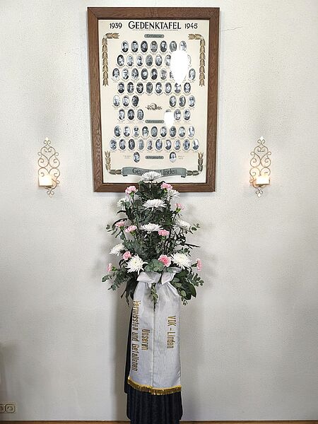 Blumengebinde des VDK Linden in der Protestantischen Kirche Linden - Volkstrauertag 2025