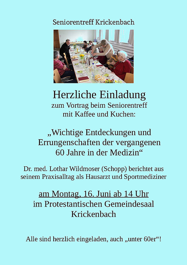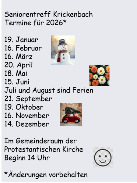 In der Regel am 3. Montag im Monat treffen sich ab 14 Uhr Seniorinnen und Senioren Ü60 ab 14 Uhr zu einem bunt gemischten Miteinander im Protestantischen Gemeindesaal Krickenbach.