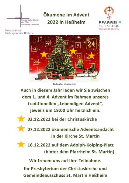 Auch in diesem Jahr treffen wir uns wieder zum ökumenischen "Lebendigen Advent" in Heßheim. Zum Advent gehört es, zusammen zu kommen, sich Zeit zu nehmen, Lieder zu singen, die gute Botschaft von Gott, der uns nahe kommt, gemeinsam zu hören. Dabei tut es gut, gemeinsam zu feiern. Anschließend gibt es Glühwein und Kinderpunsch.