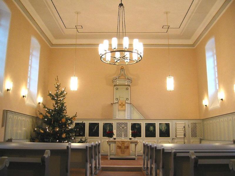 Der rechteckige Kirchenraum ist ein recht nüchterner, fast schmuckloser Saal mit flacher Decke. Das Innere der Kirche besitzt eine von zwei antikischen Säulen gestützte Empore mit aufgemalter Felderung. Die einzig schmückenden Accessoires sind ein spätbarockes Orgelgehäuse auf der Holzempore und ein Bildfries unter der Kanzel. Die Kirche ist denkmalgeschützt.