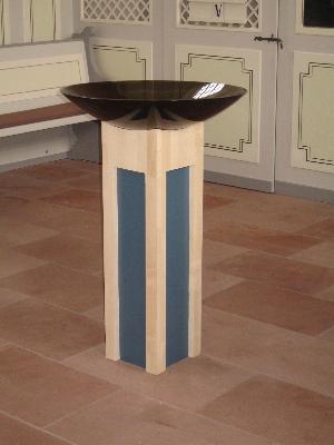 Der Künstler Martin Schöneich aus Vorderweidenthal gestaltete den Taufstein aus Holz und einem großen Glasbecken. Der Kerzenständer wurde ebenfalls aus Holz gefertigt, passend zum Taufstein. Beide Gegenstände sind transportabel und lassen den Altarraum weiterhin variabel nutzen.