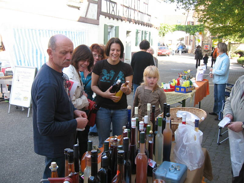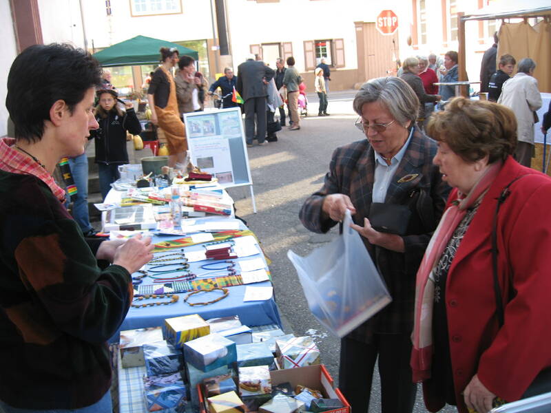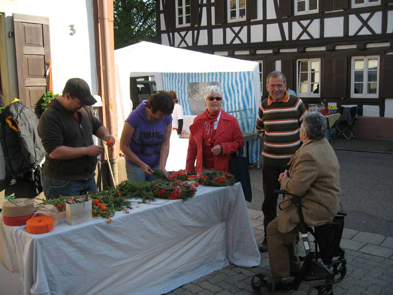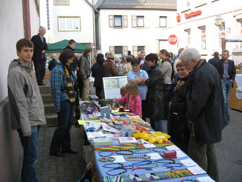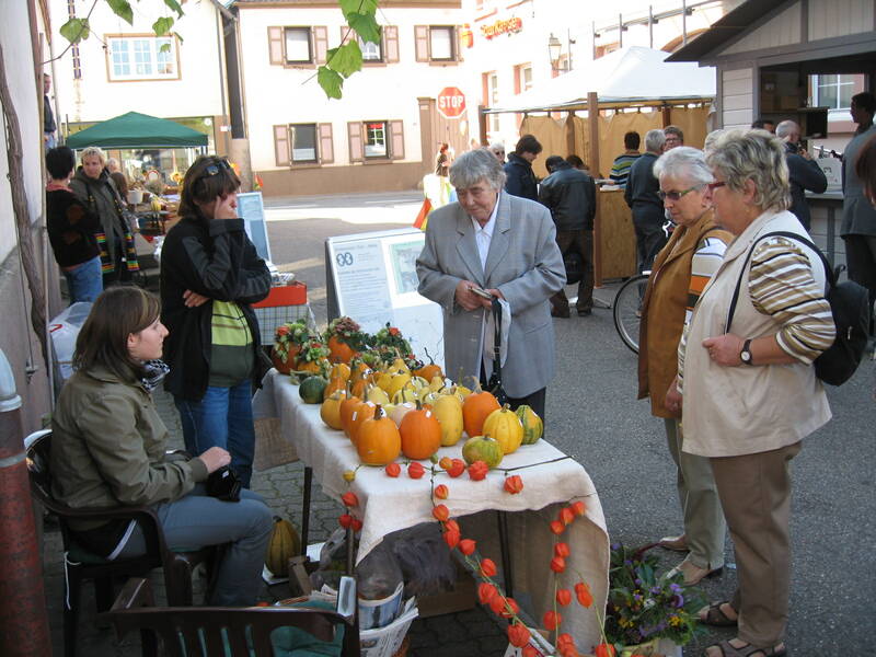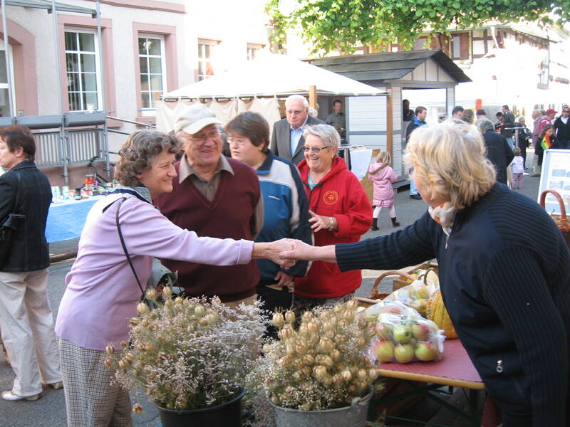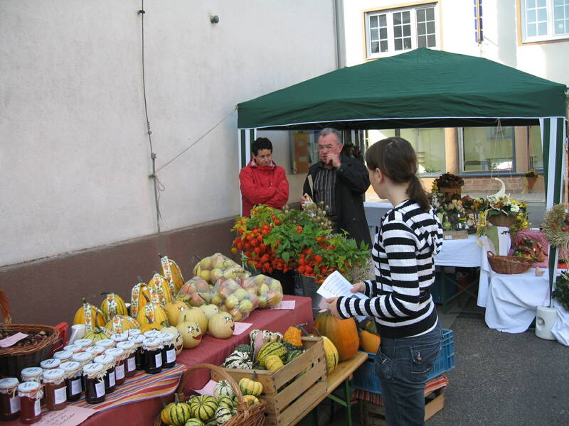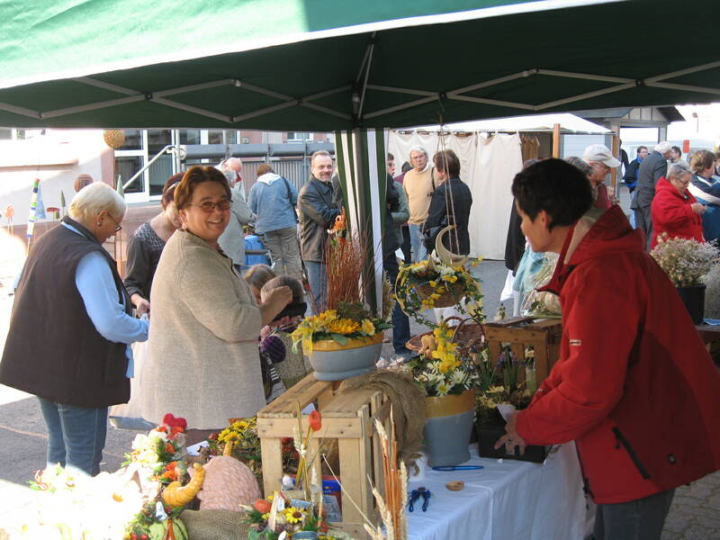 Von 11 – 17 Uhr werden handwerkliche und landwirtschaftliche Produkte angeboten. Von einheimischen Erzeugern können Äpfel, Kürbisse, Marmeladen und anderes erworben werden. Backwaren (frische Brezeln, Quarkbällchen und Steinofenbrot) gehören ebenso zum Angebot wie handgearbeiteter Perlenschmuck, frisch gebundene Türkränze, kunstvolle Gestecke, Socken, und weitere künstlerische Angebote (Acrylbilder, Gartenkeramik). Beim Workshop "Stoffmalerei" finden Kinder Beschäftigungsmöglichkeiten. Produkte aus fairem Handel bereichern das Angebot und werden der Aufmerksamkeit der Besucher ebenso empfohlen wie der Infostand über die Partnergemeinde Prestea/ Ghana.