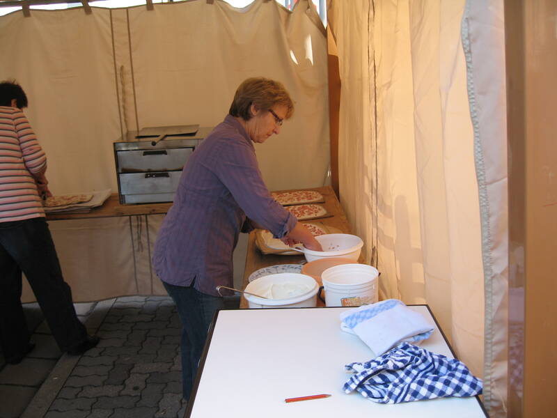 Am Sonntag waren schon um 8 Uhr die ersten Aktivitäten in der Kirchstraße zu sehen. So wurde der Pavillon zum Flammkuchenbacken und das Equipment dazu aufgebaut. Nach und nach kamen auch die Marktbeschicker und bauten Ihre Stände an den markierten Plätzen auf. Schon früh war erkennbar, dass es ein sonniger schöner Tag werden wird.