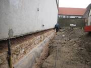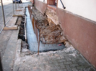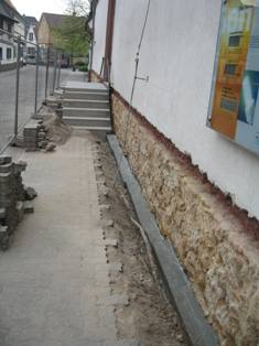 Der Sockel wird mit vorgebauten Sandsteinplatten mit Hinterlüftung verkleidet, so dass die aufsteigende Feuchtigkeit abgeleitet werden kann. Auf der Südseite im Kirchgarten, wird zusätzlich noch Kiesbett eingebaut, so dass der Schlagregen versickern kann.