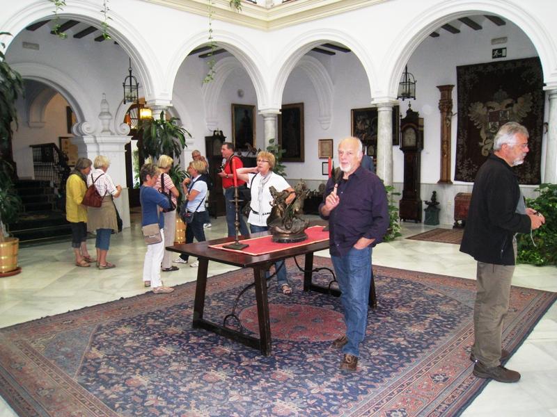 Bei Regen und kühler Temperatur machen wir (23 Personen) uns auf den Weg ins sonnige Andalusien. Ein Flieger der Lufthansa bringt uns von Frankfurt nach Malaga. Gleich am dortigen Flughafen beginnt die Erlebnistour: 6 Koffer von unserer Gruppe kommen nicht an!! Somit begegnen wir mit 1-stündiger Verspätung unserem dortigen Reiseleiter Matthias der uns zum wartenden Bus bringt. Zum Hotel bei Sevilla müssen wir noch 2 1/2 Std. fahren. Es ist schon ziemlich spät, schnell belegen wir unsere Zimmer und begeben uns dann gleich zum Abendbuffet. An 4 Abenden das gleiche Essen!! Nicht so der Hit, dieses Hotel.