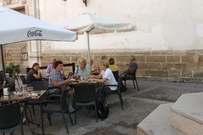 CORDOBA ist das Ziel am Mittwoch. Entlang des Rio Guadalquivir, der Andalusien von Ost nach West durchquert und in den Atlantik mündet, erreichen wir um die Mittagzeit die einstige Stadt der Kalifen. Beeindruckend, diese riesige Moschee-Kathedrale! Einzigartig und ergreifend dieser Säulenwald mit über 800 Säulen und der Gebetsnische (Mihrab) mit der prachtvollen Marmorkuppel. Und dann, doch etwas störend, die Kathedrale mitten in der Moschee! Gleich daneben das ehemalige Judenviertel mit seinen engen Gassen und der einzigen in Südspanien erhaltenen Synagoge. Freizeit!! Auf einer Mauer sitzend lassen wir uns ein lecker belegtes Baquette schmecken, bummeln durch die Gassen, treffen immer wieder Mitreisende und probieren an luftigem Ort eine leckere Sangria. Zurück im Hotel: 5 Koffer sind eingetroffen!! Wer sind die Glücklichen? Hab mich riesig gefreut, obwohl ich schon sagte: jetzt brauch ich ihn auch nicht mehr. „Was zieh ich nur an“? Letztes Abendessen, Terrassien und Kofferpacken.
