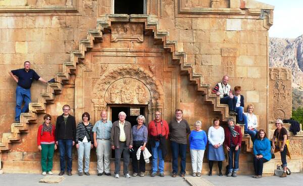 Unter der bewährten Leitung von Ralf Piepenbrink starteten wir (10 Billigheim-Ingenheimer und 7 liebe Auswärtige) am 11. Oktober ab Frankfurt, via Wien nach Jerewan. Mit Verspätung und einem Schreck nach einem Durchstart kurz vor der Landung in Wien kamen wir in der Frühe des 12. Okt. in unser Hotel in Jerewan, der Hauptstadt Armeniens. Am Flughafen lernten wir bereits unsere liebe Reiseleiterin Nazeli und den Busfahrer kennen, der uns sicher nach Süd und Nord durch das Land schaukelte.