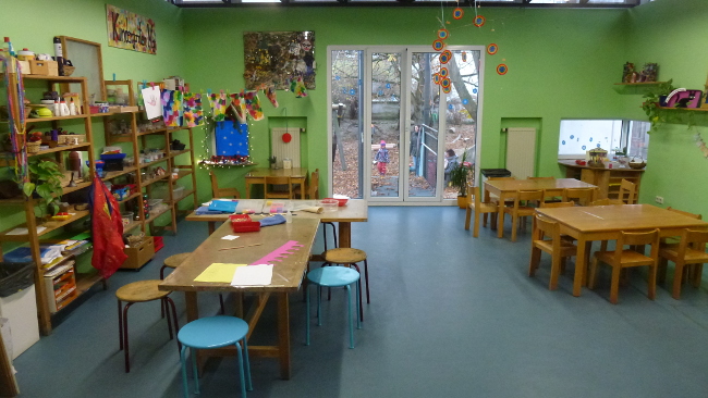 Die Kinder lernen, wie sie Farben zur vielfältigen phantasievollen Gestaltung einsetzen können und sie entwickeln hier ein Verständnis für Ästhetik. Das Atelier ist in Ort, an dem blaue Kühe möglich sind, Schablonen verbannt wurden und Kinder auf andere Weise über sich Auskunft geben.