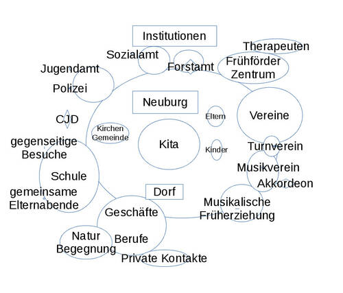 "Unsere Kita ist ein wichtiger Bestandteil der Ortsgemeinde Neuburg. Wir sind mit örtlichen Vereinen vernetzt, die sich in unserer Kita aktiv engagieren. Bei Fragestellungen und Unterstützungsbedarf der Eltern und Kinder arbeiten wir mit Beratungsstellen, Institutionen und Fachdiensten zusammen. Wir möchten gemeinsam mit unseren Vernetzungs- und Kooperationspartnern Eltern und Kinder bestmöglich begleiten und unterstützen."