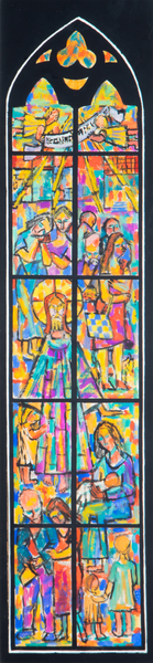 Nun befinden sich auch die Entwürfe zu diesen Fenstern in der Kirche. Man kann also genau den Werdegang von ersten Ideen zur „glaslichen“ Realisierung verfolgen. Und es gibt auch eine Broschüre (erhältlich zu 3 Euro im Siebenpfeifferhaus), die mit zahlreichen Abbildungen und informativen Texten von Heinz Weinkauf Einblicke gibt. Im Sommerhalbjahr ist die Kirche freitags von jeweils 11 bis 13 Uhr geöffnet. Auch sonntags besteht die Möglichkeit, Papier und Glas in Augenschein zu nehmen.