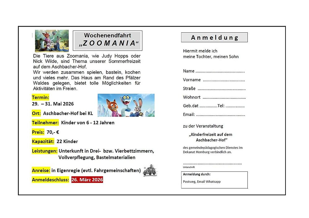 Hast du Lust auf ein Wochenende voller Abenteuer, Spiele und Natur? Dann komm mit zur Kinderfreizeit vom 29.–31. Mai auf den Aschbacher Hof bei Kaiserslautern im wunderschönen Pfälzer Wald! Eingeladen sind alle Kinder von 6 bis 12 Jahren. Gemeinsam verbringen wir drei spannende Tage. Unser Thema ist der Film „Zoomania“, das uns durch das Wochenende begleitet. Freut euch auf kreative Bastelaktionen, lustige Spiele im Freien und spannende Aufgaben rund um die bekannten Figuren aus dem Film. Wir wohnen in einem Selbstversorgerhaus, das heißt: Wir kochen gemeinsam – so wird das Essen zu einem echten Gemeinschaftserlebnis. Freut euch auf ein Wochenende mit euren Freunden, viel Bewegung, Kreativität und jeder Menge Spaß!