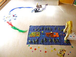 Bei der Geschichte von Arche Noah , die mit Hilfe eines Kamishibais visuell dargestellt wurde , konnte man lauschen und mit Legematerial die Erzählung nachstellen.