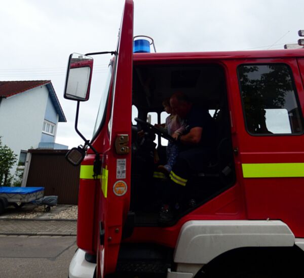 Die Feuerwehrleute überprüften, ob sich noch Personen in den Räumlichkeiten des Kindergartens befanden. Im Anschluss konnten sich die Kinder das Feuerwehrauto anschauen, Fragen stellen und den ein oder anderen Knopf betätigen.