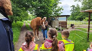 Auf dem Rückweg kamen die Kinder an einem Pferdehof vorbei. Da Frau Kreher, unsere aktuelle Berufspraktikantin, die Pferde kannte, konnte jedes Kind eine halbe Karotte an eines der Pferde verfüttern. Das Pferd freute sich deutlich und verbeugte sich zum Schluss.
