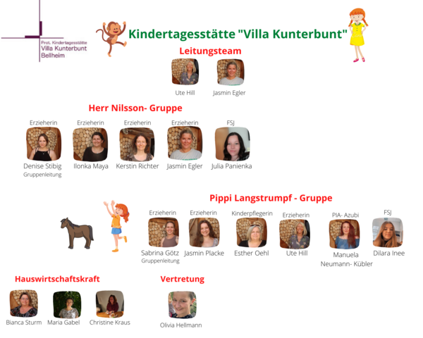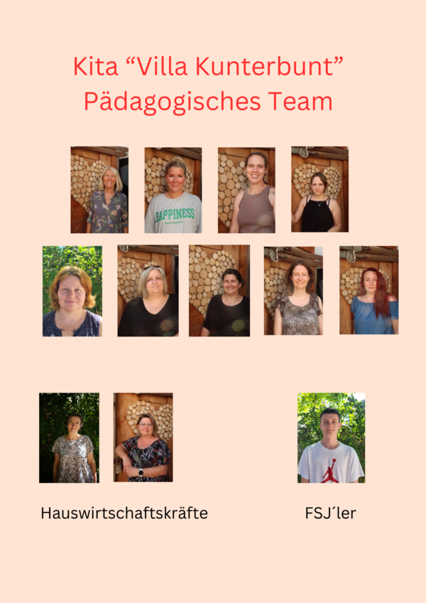 Unser Team besteht aus qualifizierten Fachkräften in Voll- und Teilzeit, Praktikanten sowie Mitarbeiterinnen im hauswirtschaftlichen Bereich. Unser Personalschlüssel entspricht der gesetzlichen Vorlage auf der Basis von zwei geöffneten Kindergartengruppen. Im Eingangsbereich findet der Besucher Fotos vom Personal. Jede Kollegin unseres Teams verfügt über individuelle Kompetenzen, Erfahrungen und Begabungen. Gemeinsam sind wir ein starkes Team, das sich mit den Aufgaben und Zielen der Einrichtung identifiziert und methodisch auf dem neuesten Stand arbeitet. In unseren wöchentlichen Teamsitzungen tauschen wir gemeinsame Visionen aus und setzen uns dabei Ziele. Durch Fort - und Weiterbildungen erhalten wir Einblicke in neuste Erkenntnisse und Anregungen für unsere Arbeit. Die Inhalte geben wir in den Teamsitzungen an das Kollegium weiter. Wir sehen uns als ein kompetentes Team, das seinen fachlichen Auftrag: die Bildung, Erziehung und Betreuung der uns anvertrauten Kinder- in der Kindertageseinrichtung realisiert.