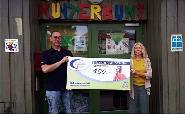 Eigentlich wollte der Kindergarten am verkaufsoffenen Sonntag im März die Bewirtung der Besucher bei A&T Computer übernehmen. Durch Ausbruch der Pandemie und der kurzfristigen Absage sind dem Kindergarten die Einnahmen entgangen. A&T Computer möchte sich dennoch für die Bereitschaft bedanken und füllt diese Lücke durch einen Spendencheck in Form eines Gewerbeverbands-Einkaufsgutscheines in Höhe von 100,00 Euro.