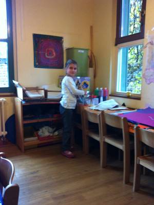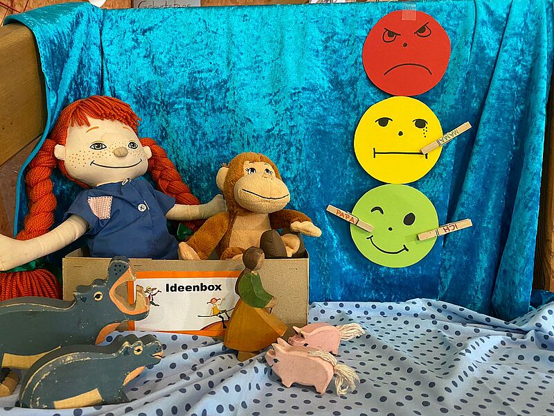 In der Pippi- Langstrumpf- Gruppe erwartet uns eine Kuschelecke zum Vorlesen und Schmöckern, mit einem interessanten Buch auf dem Schoss der Erzieherin steigt nach dem Trennungsschmerz die Stimmung schnell wieder.