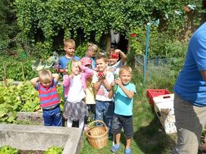 Künftig hängen keine Frühstückszettel zum Eintragen mehr an der Gruppentür. Die Villa Kunterbunt sieht sich mit ihrem ökologischen Konzept auch beim Thema Umweltschutz und gesunde Ernährung unserer Kinder in der Vorbildrolle. Wir wollen weniger Müll produzieren durch bewussten Einkauf, d.h. Früchte aus der Region saisonal einkaufen.Dies geschieht mit den Kindern zum Teil gemeinsam. Einmal die Woche kaufen wir mit den Kindern Obst und Gemüse .