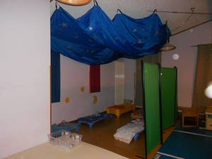 Die Schlafenskinder sind nicht mehr im Interaktionsraum der Pippi- Langstrumpf- Gruppe, sondern im Turnraum untergebracht. Der Raum wurde liebevoll zu einem Schlafraum umgewandelt. Somit ist gewährleistet das die Schlafenskinder ungestört ruhen können und die restlichen Kinder ihrem Spiel ohne Rücksicht nehmen zu müssen nachgehen dürfen.Durch tatkräftige Unterstützung von Herrn Bidmon konnten wir das Projekt schnell abschließen. Auch beim Schlafen unserer Kinder ist es uns wichtig, dass immer eine Bezugsperson anwesend ist. Es ist uns eine Herzensangelegenheit, dass die Kinder beim Aufwachen ein vertrautes Gesicht sehen.