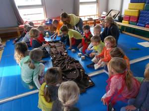 Am Mittwoch vor Ostern kam Frau Pfarrerin Heike Neu, um gemeinsam mit allen Kindern und Erzieherinnen im Turnraum einen Ostergottesdienst zu feiern. Mit Tüchern und Bildern, die durch ihre Farbwahl Traurigkeit oder Freude wiedergaben und Symbolen wie ein Esel, das Abendmahlgeschirr, ein Seil, ein großer Stein und ein Herz erzählte Frau Neu für und mit den Kindern die Erlebnisse Jesu weiter.