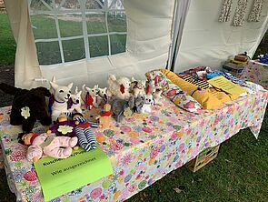 Aufgrund von Corona konnten wir leider kein Jubiläumsfest veranstalten. Kreativität war hier gefragt: Wir organisierten eine „Jubiläums(-Einbahn)-Straße“ mit Verkaufsständen von selbstgenähter Kleidung, Bettwäsche, Puppen und Kuscheltiere sowie selbstgebackenen Köstlichkeiten.