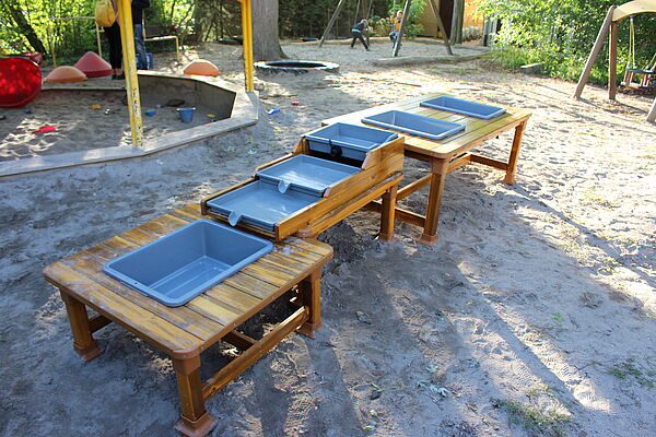Ein weiteres Highlight im Garten ist die neue Matschküche. Die Schulanfängerinnen und Schulanfänger 2022/2023 sowie deren Eltern hatten dies als Abschiedsgeschenk im Sinn. Gemäß der Kindergarten-Philosophie sollte es ein nachhaltiges, robustes und mobiles gerötete sein. Sehr gerne stockten wir die Spenden der Familien auf, um eine Matscküche anzuschaffen, an der noch sehr viele Generationen von Kindergartenkindern spielen können.