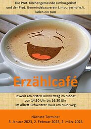 Die Protestantische Kirchengemeinde Limburgerhof und der Protestantische Gemeindebauverein Limburgerhof e.V. laden herzlich ein zum Erzählcafé ins Albert-Schweitzer-Haus am Donnerstag, den 5. Januar 2023 von 14:30 Uhr bis 16:30 Uhr.