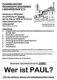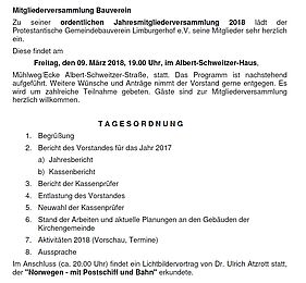 Am Freitag, den 24. Februar um 19.00 Uhr lädt der Prot. Gemeindebauverein Limburgerhof e.V. zu seiner jährlichen Mitgliederversammlung ins Albert-Schweitzer-Haus ein.