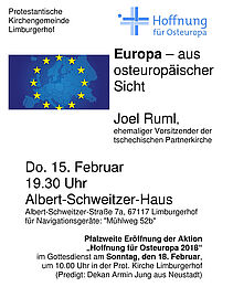 Die Prot. Kirchengemeinde Limburgerhof und das Diakonische Werk der Pfalz laden herzlich zu Vortrag und Diskussion „Europa – aus osteuropäischer Sicht“ am Donnerstag, den 15. Februar, um 19.30 Uhr im Albert-Schweitzer-Haus Limburgerhof mit...