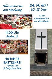 Im Rahmen einer „Offenen Kirche am Markttag“ begehen wir am Samstag, den 14. Mai, das 40-jährige Jubiläum des Bastelkreises. Ab 10.00 Uhr öffnet in der Kirche der Verkaufsstand des Bastelkreises. Um 10.30 Uhr spielt vor der Kirche der...