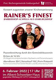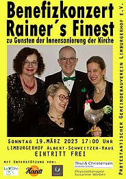 Der Prot. Gemeindebauverein lädt am 19. März um 17.00 Uhr zu einem Benefizkonzert mit Rainer's Finest ins Albert-Schweitzer-Haus Limburgerhof ein. Der Erlös ist für die aktuelle Innensananierung der Prot. Kirche Limburgerhof bestimmt.