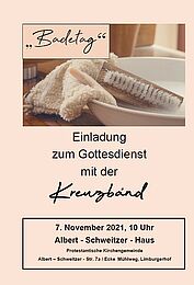 Am Sonntag, den 7. November, laden wir zu einem Kreuzbänd-Gottesdienst ein unter dem Motto „Badetag“. Der Gottesdienst findet um 10.00 Uhr im Albert-Schweitzer-Haus statt. Die musikalische Gestaltung übernimmt unsere Kreuzbänd mit Gerd...