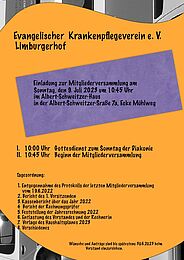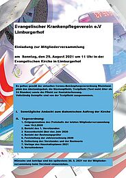 Am Sonntag, den 29. August 2021 findet um 11.00 Uhr die Mitgliederversammlung des Ev. Krankenpflegevereins Limburgerhof e.V. in der Prot. Kirche Limburgerhof statt.