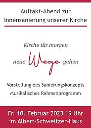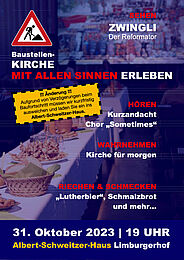Die als Baustellen-Event angekündigte Veranstaltung „Kirche mit allen Sinnen erleben“ am Reformationstag, 31. Oktober, muss leider ins Albert-Schweitzer-Haus verlegt werden. Ein Lieferengpass hat die Bauarbeiten in der Kirche im Bereich der...