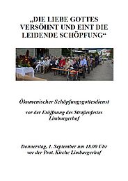 Vor Beginn des Straßenfestes feiern wir wieder den Ökumenischen Schöpfungsgottesdienst. Am Donnerstag, den 1. September, versammeln wir uns um 18.00 Uhr vor der Prot. Kirche. Der Gottesdienst steht unter dem Thema: „Die Liebe Gottes...