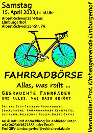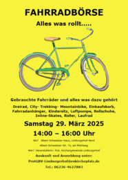 Am Samstag, den 15. April, sind wieder von 14-16 Uhr die Türen des Albert-Schweitzer-Hauses für die beliebte Farradbörse geöffnet. Nähere Infos auf dem Plakat.