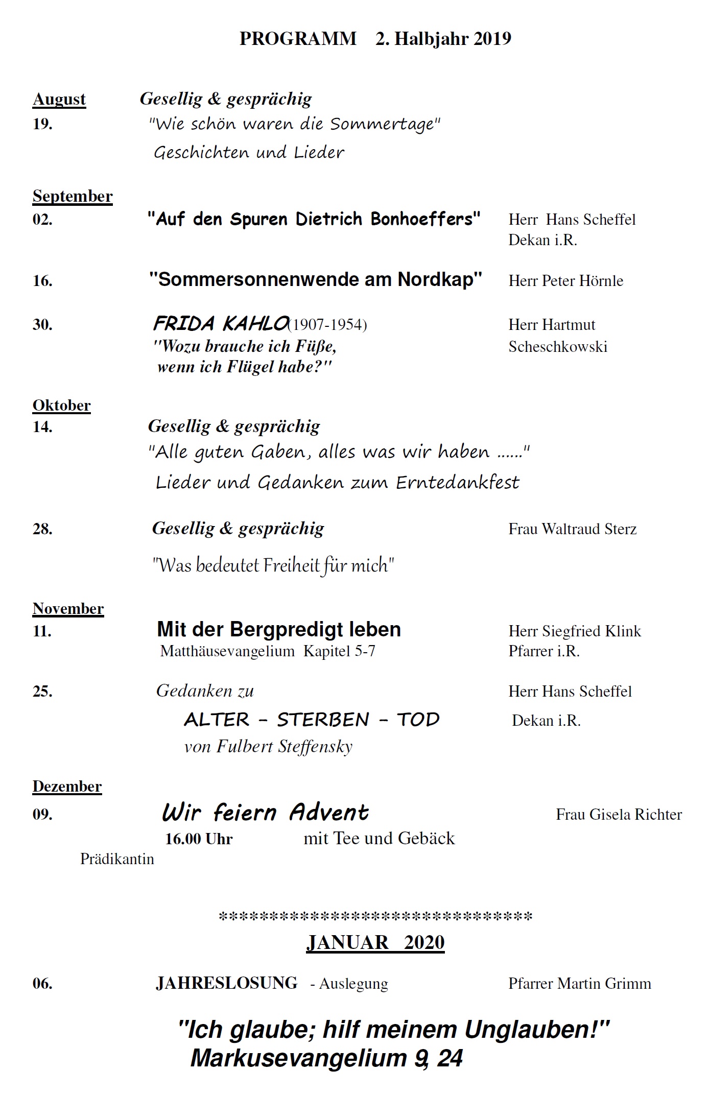 Im neuen Programm sind Thema: Dietrich Bonhoeffer, eine Reise ans Nordkap, Frida Kalow, die Bergpredigt und vieles andere mehr. Sie sind herzlich eingeladen!