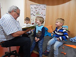 Seit einiger Zeit besucht uns jeden Dienstag Nachmittag Herr Scheschkowski als "Vorleseopa" in unserer Einrichtung, um gemeinsam mit den Kindern Bilderbücher zu betrachten, vorzulesen und Geschichten zu erzählen. Die Kinder haben hierbei die Gelegenheit, in kleiner Runde und gemütlicher Atmosphäre ganz in die Welt der Geschichten und Märchen einzutauchen, durch die sie von Herrn Scheschkowski in liebevoller und geduldiger Weise geführt werden