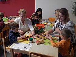 Zweimal im Jahr veranstalten wir in unserem Kinderbistro einen Eltern-Kind-Kochkurs. Unter Anleitung einer pädagogischen Fachkraft stellen die Eltern mit ihren Kindern ein leckeres Menue her, das sich alle zusammen am Ende schmecken lassen. Hier bekommen Eltern die ein oder andere Rezeptidee für die Küche zu Hause und alle erfahren Interessantes über eine gesunde, ausgewogene Ernährung.