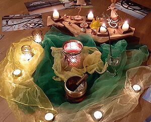 Anschließend im Turnraum in ruhiger, erholsamer Stimmung konnte man den eigenen Körper durch progressive Muskelentspannung sowie mit Klangschalenklänge zur Ruhe kommen. Mit dem darauffolgenden Märchen endete der offizielle Teil des Abends.