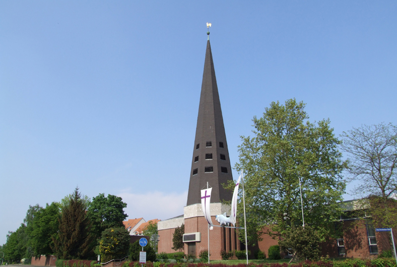 Durch das zum Altarbereich hin ansteigende Dach mit dem Kreuz un durch den hohen spitzen Kirchturm ist die Kirche von außen deutlich als Kirchenraum zu erkennen. Diese Architektur hat zwei Motive:
