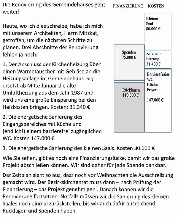Am 19. März hat der Bezirkskirchenrat grünes Licht gegeben für die 2. und 3. Phase der Gemeindehaussanierung mit Kosten von 255.000 €. 40.000 € bekommen wir als Darlehen, 29.000 € bekommen wir vom Bund als Zuschuss für die energetische Sanierung. Ich bin immer wieder sehr froh und dankbar für die Spenden vieler Gemeindeglieder, die sich inzwischen auf 90.000 € summieren. Die andere Hälfte der Restsumme sind Rücklagen, u.a. auch Mittel, die die Landeskirche den Kirchengemeinden für Baumaßnahmen überweist.