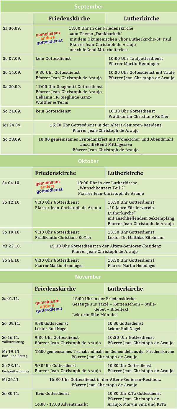 Übersicht Gottesdienstplanung für Lutherkirche und Friedenskirche bis November 2025