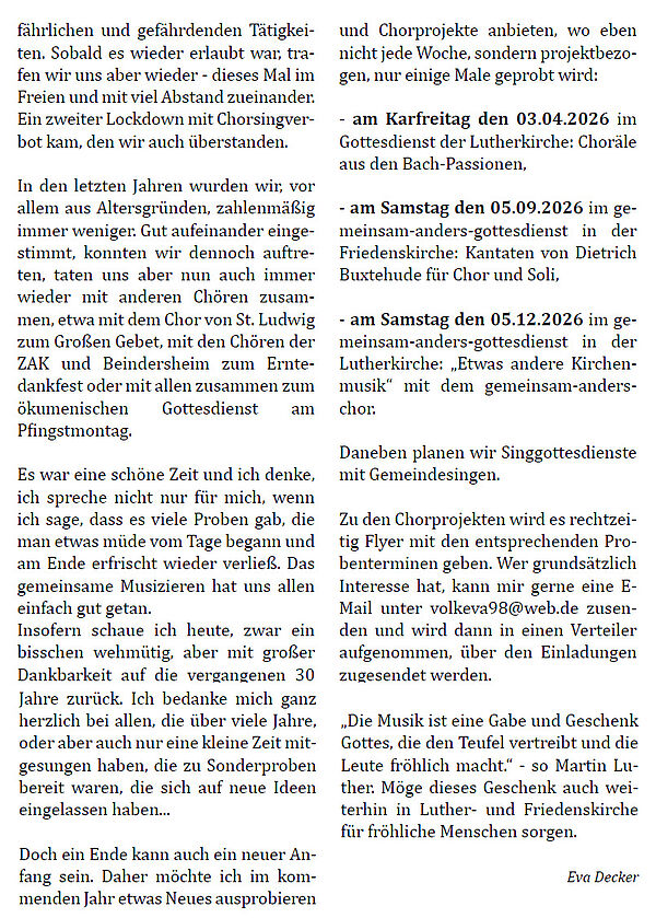 Zum 18.01.2026 hat der ökumenische Chor nun, so wie es ihn bisher gab, seinen letzten Auftritt (siehe dazu unten den Auszug aus dem Gemeindebrief 12-2025).