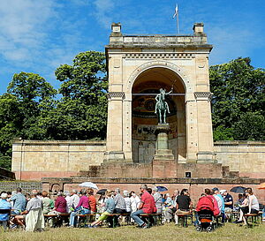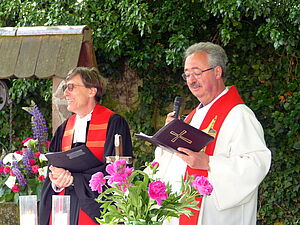 In einer Zeit, in der auch die großen Kirchen zu einer Minderheit in unserer Gesellschaft werden, erscheint es umso wichtiger, den christlichen Glauben lebendig und fantasievoll unter die Menschen zu bringen. Das fängt bei Gesprächen und Begegnungen an. Aus diesem Grund gibt es in unserer Gemeinde einmal im Monat ein Kirchencafé, das bei schönem Wetter auf dem Kirchenvorplatz stattfindet. Wir erleben, dass vorbeikommende Menschen stehen bleiben und bei einer Tasse Kaffee Kontakt aufnehmen. Auch erscheint es uns wichtig, Gottesdienste an anderen Orten zu feiern und so Menschen zu erreichen. Das Bild zeigt "Kirche im Grünen" am Friedensdenkmal Edenkoben, veranstaltet von unserer Kooperationszone. Unsere Gemeinde bietet daneben einen ökumenischen Gottesdienst am Schloßweiher/Kirrweiler, einen Waldgottesdienst an der Totenkopfhütte und einen Gottesdienst mit Jazz-Musik im Innenhof der Vinothek Weinkammer in Maikammer an.