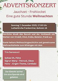 Am Freitag, den 24. Juni 2022 um 19:30 Uhr findet in der Lutherkirche ein Konzert des Trio Sanssouci statt. Eingewoben in die Musik, gespielt von Sohee Oh, Flöte, Sigrun Meny-Petrucck, Oboe, Hans-Jürgen Thoma, Cembalo sind Szenen aus der Stadtgeschichte: Die Urkunde von 772 – Gründung des Klosters durch Erkenbert – Ankunft von Petrus Dathenus – Festungsbau – Fabrikenstadt Carl Theodors – Zerstörung im 2. Weltkrieg – Frankenthal heute, die Pfarrer Martin Henninger darstellen wird.